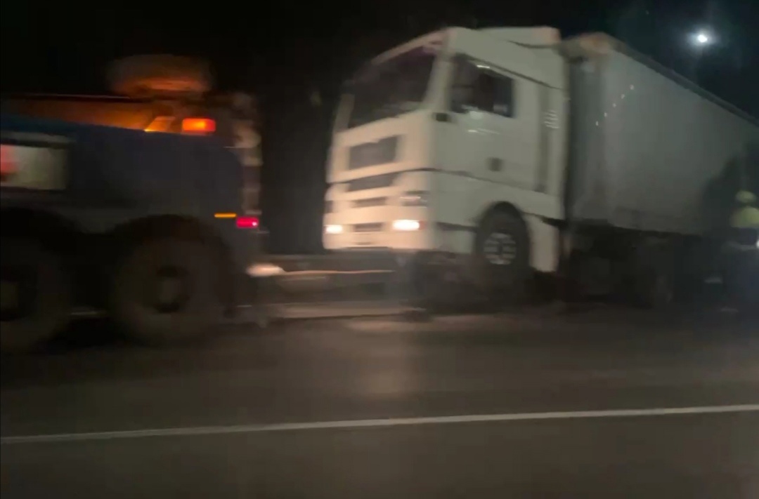 В результате ДТП оказался заблокирован въезд на эстакаду по направлению к поселку Иншинский. На момент публикации новости один из большегрузов пытаются убрать с дороги.