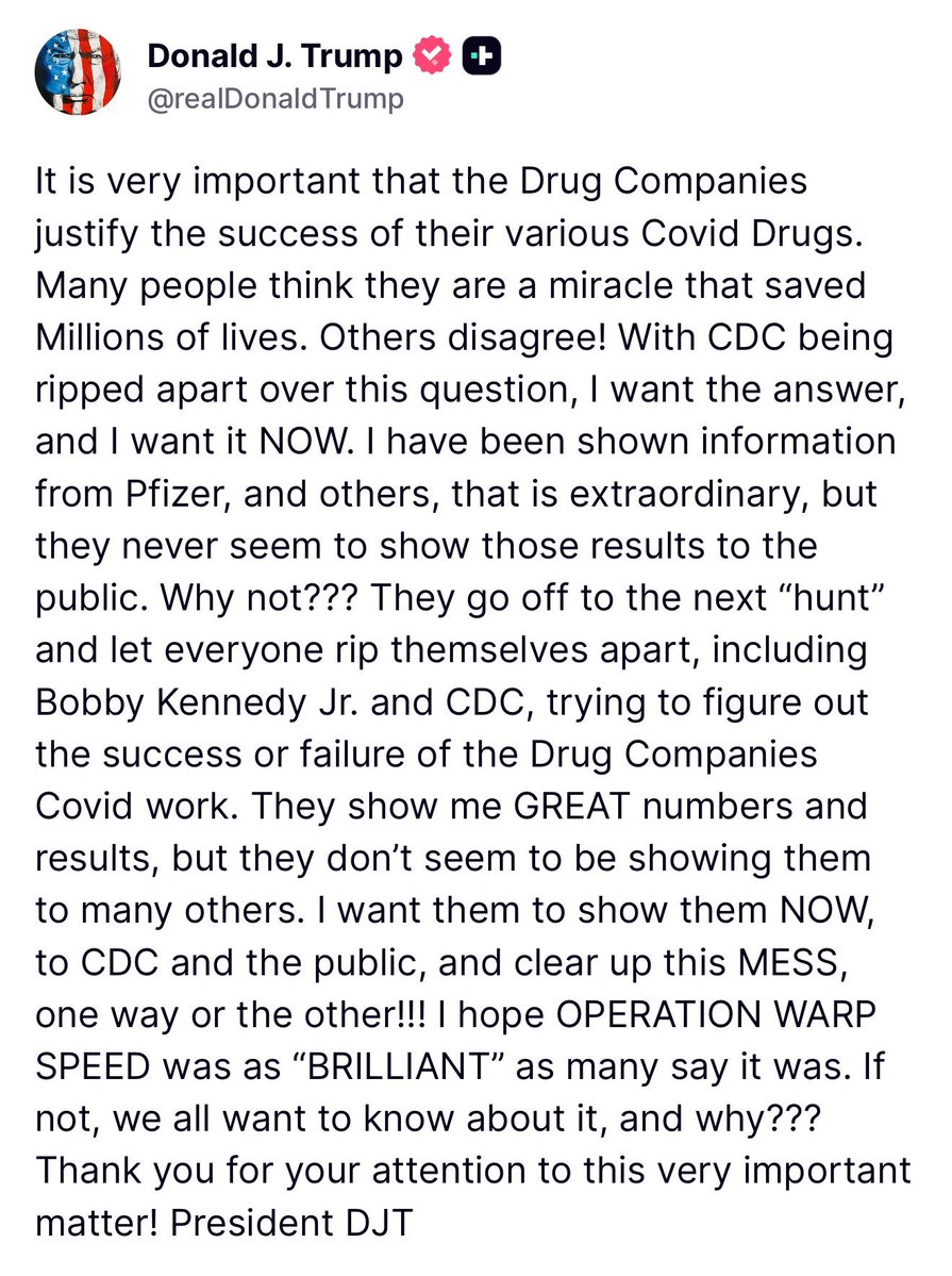 «Очень важно, чтобы фармацевтические компании оправдывали успех своих различных препаратов от COVID-19. Многие считают их чудом, спасшим миллионы жизней. Другие с этим не согласны!» — написал он в Truth Social.