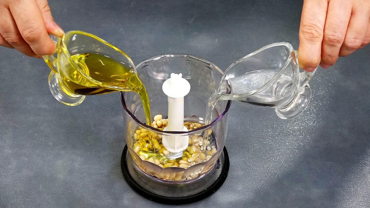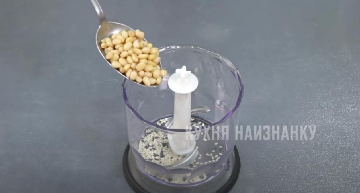 Соединяю в чаше блендера 1-2 ч.л. кунжута (предварительно обжариваю на сухой сковороде) и столовую ложку кедровых орешков. Орешки, кстати, можно менять. От этого и вкус соуса немного будет меняться. Очень вкусно также с кешью или с грецкими орешками.