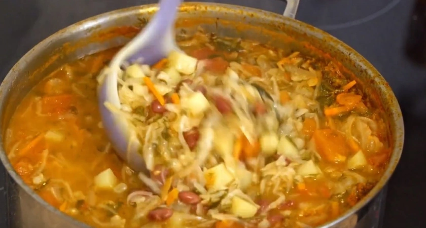 Если мы положим все вместе, то кислая среда будет мешать картофелю вариться — капуста разварится, а картошка останется сырой. Так что сначала картошка, отварить ее до полуготовности, и уже затем —поджаренные овощи и квашеная капуста. Дальше все должно томиться минимум 20–30 минут, но не более часа. Некоторые картофель в супе толкут, чтобы он дал взвесь.