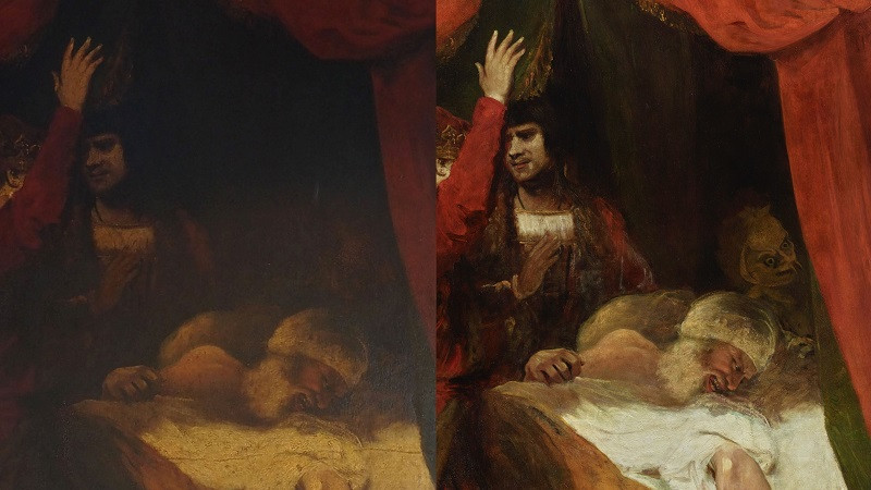 Как пишет New York Post, речь идёт о картине, запечатлевшей шекспировской сюжет «Смерть кардинала Бофорта», написанной более 230 лет тому назад. На ней изображена сцена из исторической хроники Уильяма Шекспира «Генрих VI, часть 2», в которой король становится свидетелем смерти кардинала Генри Бофорта. Реставрация показала, что в тени над постелью умирающего Бофорта скрывалась зловещая демоническая фигура.