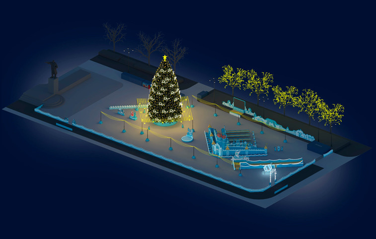 На площади установят 30-метровую искусственную елку, которую украсит гирлянда желтого цвета, говорится в документах. На ветках будет висеть не менее 55 неоновых игрушек — трости и котелки. Вокруг елки повесят своеобразный шатер из не менее 120 ниток с лампочками, общей протяженность 500 метров.