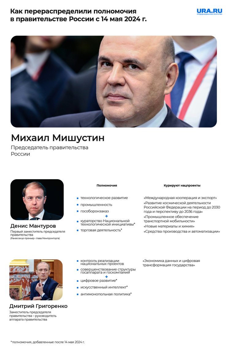 Заметные перемены произошли в перераспределении отраслей, которые курирует каждый вице-премьер. Во многом дополнительные обязанности перекликаются с задачами национальных проектов и госпрограмм. Расширение компетенций поможет опытным управленцам раскрыться в ключевых для экономики сферах и укрепить свои позиции, считают эксперты URA.RU.