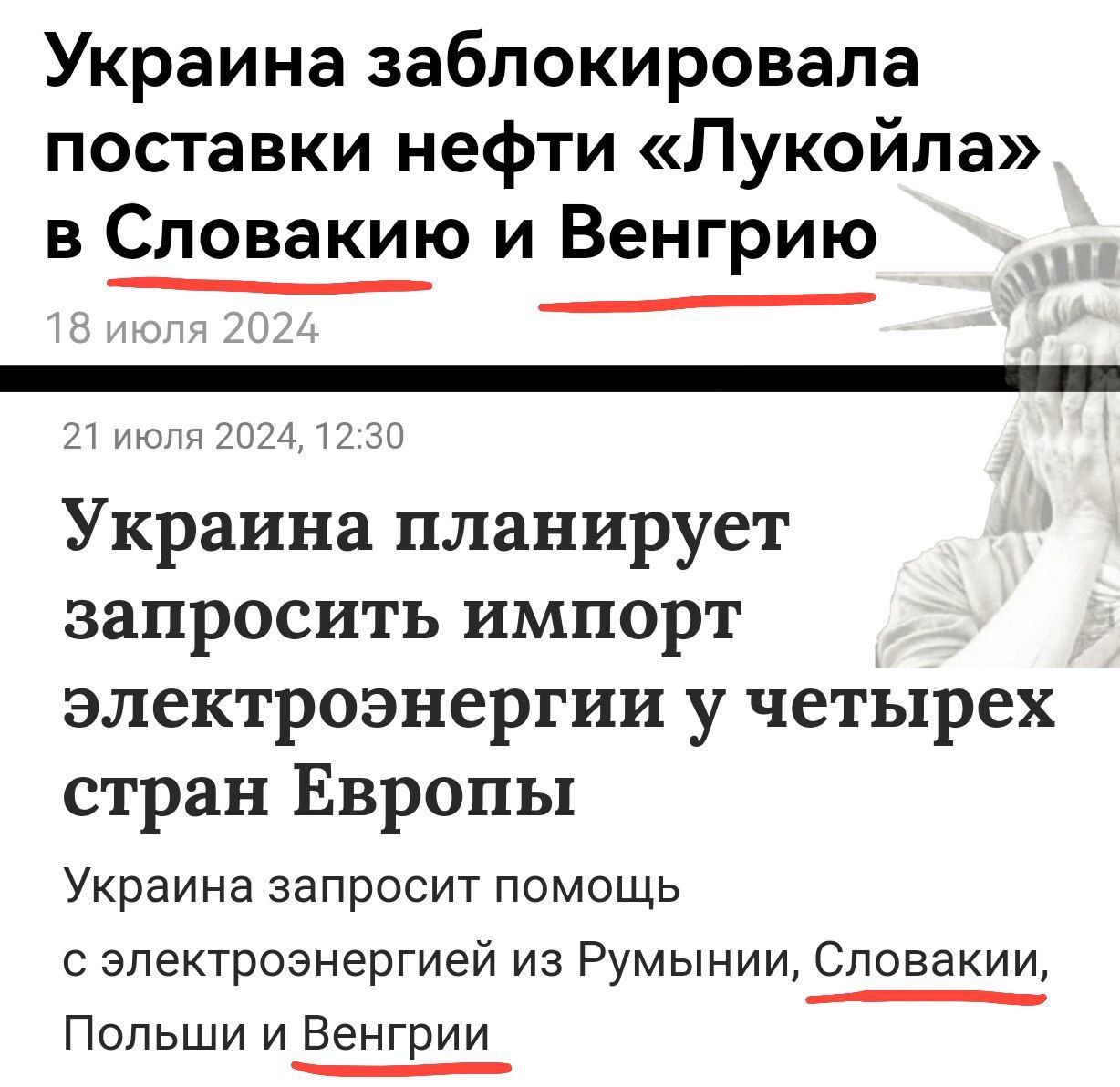Обрубила поставки нефти в Венгрию и Словакию, а через пару дней запросила у этих же Венгрии и Словакии помощи с электроэнергией.