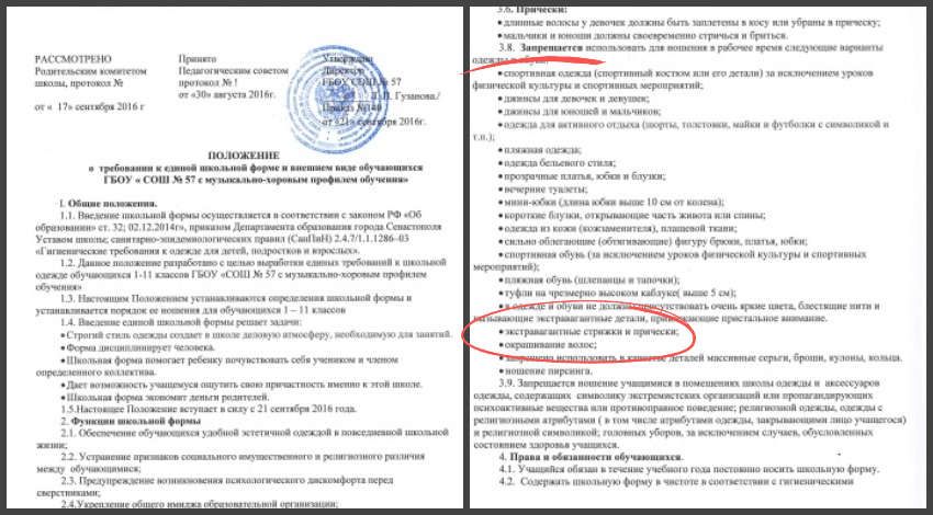 «В этой школе в положении указано, что запрещено любое окрашивание волос, запрещено ношение серёжек, крупных аксессуаров. Конкретной школьной формы нет, но есть требование ходить в официально деловом стиле: брюки, юбка, блузка. Школа ничего не нарушила», — пояснили в пресс-службе департамента.