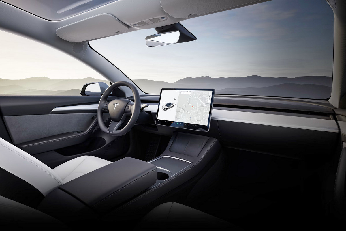 Салон тоже новый, хотя на первый взгляд он мало чем отличается от интерьера дореформенной модели. Но и передняя панель, и карты дверей – иные. Также заменили рулевое колесо, при этом подрулевых переключателей больше нет, как и у старших Model S и Model X: за управление основными функциями отвечают кнопки на спицах «баранки», а переключение режимов трансмиссии возложено на центральный планшет.