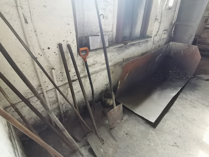 Котлы здесь нагревают так же, как делали еще в царские времена. На заднем дворе лежит куча угля.