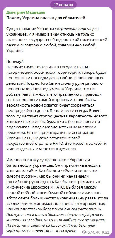 🗣 Существует стопроцентная вероятность нового конфликта с Украиной, кто бы ни находился у власти и с кем бы не вступала в коалиции эта страна, — Медведев