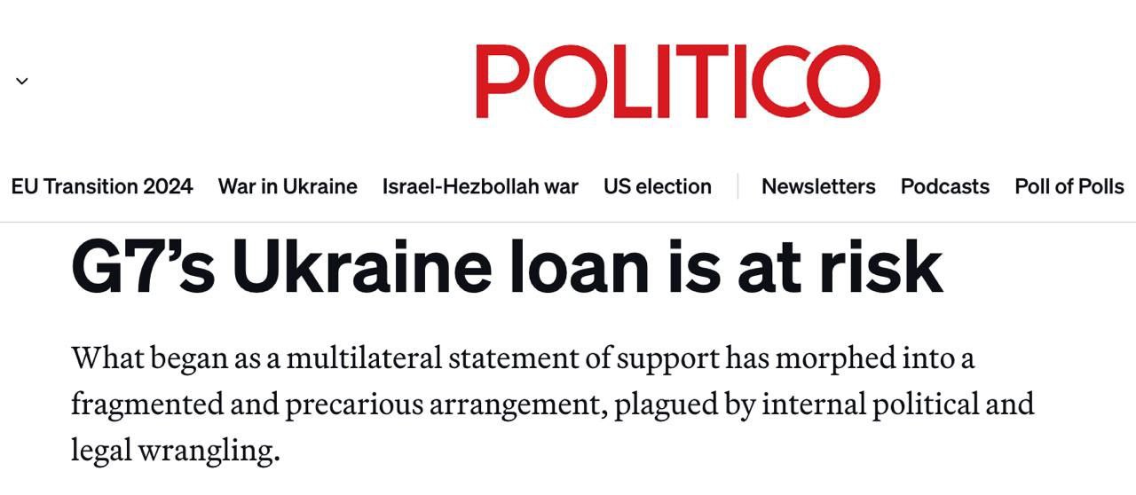 "То, что начиналось как многостороннее заявление о поддержке осажденной страны, теперь превратилось в раздробленную и шаткую договоренность, терзаемую внутренними политическими и юридическими препирательствами. А сам кредит — изначально задуманный как безрисковый для кредиторов G7 — сталкивается с реальным риском провала, если не будут приняты срочные меры", - пишет он.