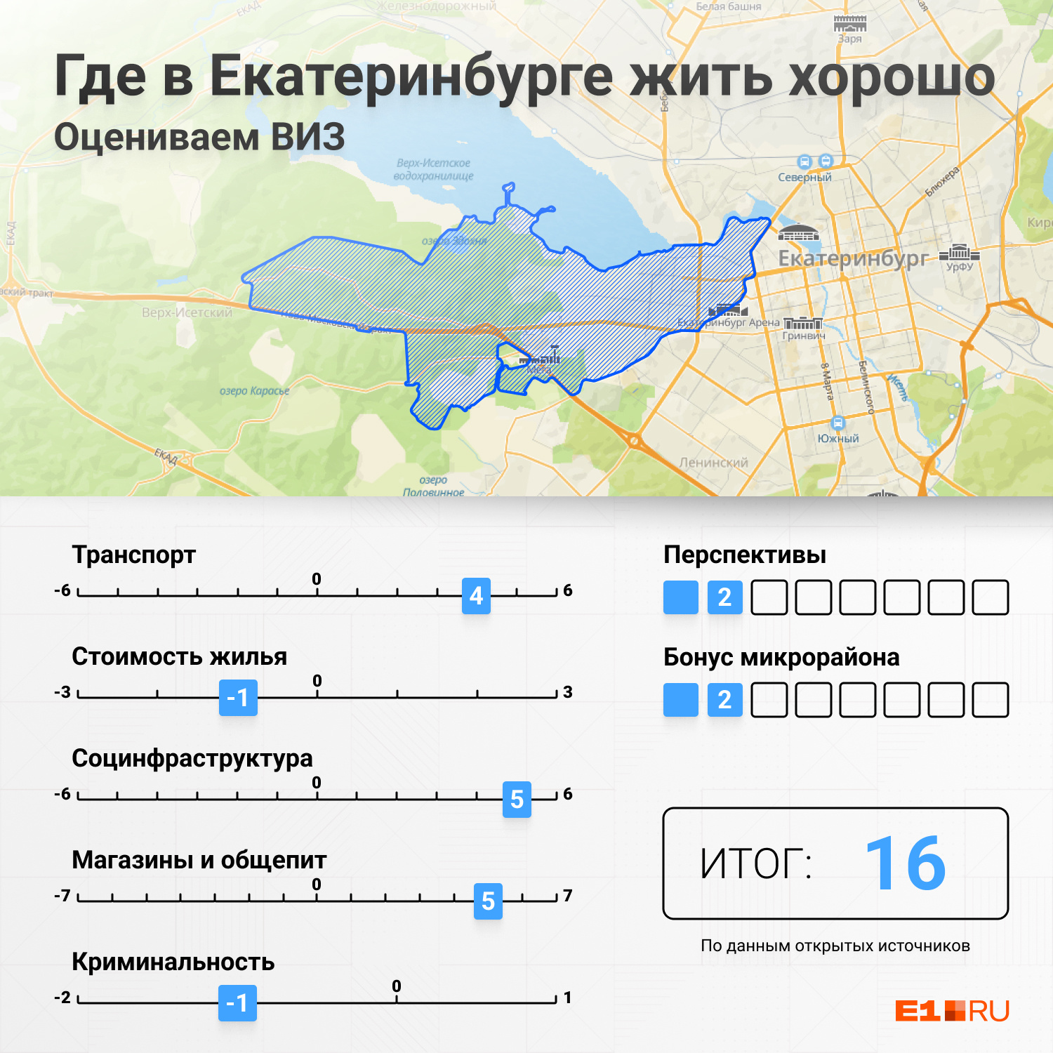 ВИЗ хорош своим расположением у центра, развитой сетью общественного транспорта и всех жизненно важных удобств, которые можно получить, никуда не выезжая. Вот метро бы еще сюда, да квартиры подешевле и поменьше криминальных конфликтов — цены бы микрорайону не было. Хоть пруд есть! Итоговая оценка ВИЗа в нашем рейтинге: 16 баллов.