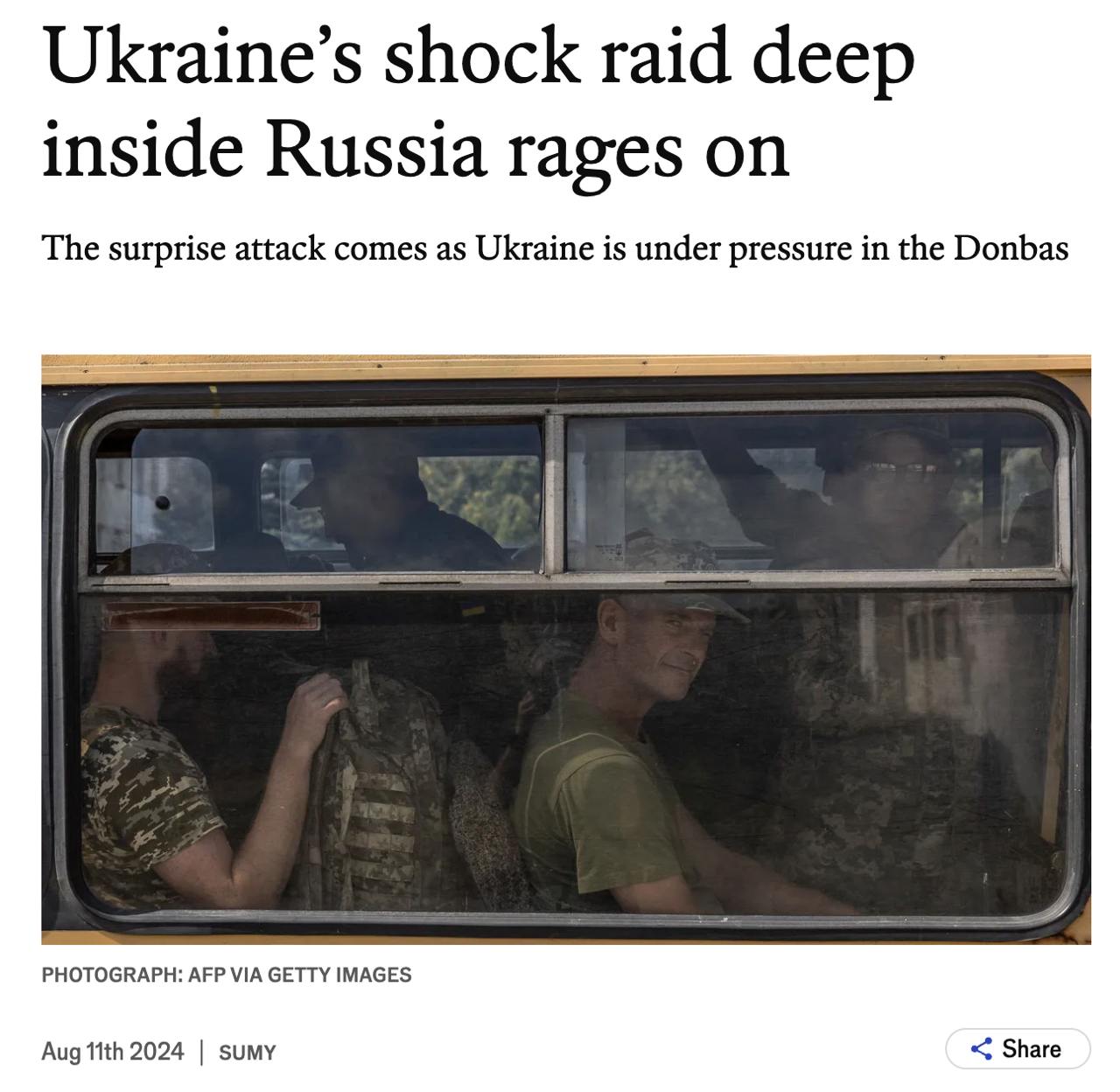 Самое забавное – для подготовки нападения на Курскую область Киев сам снял с Донецкого направления силы, чтобы обеспечить атаку. Все трое опрошенных Economist украинских солдат были сняты «с других направлений на Востоке» и даже не получили отдыха.