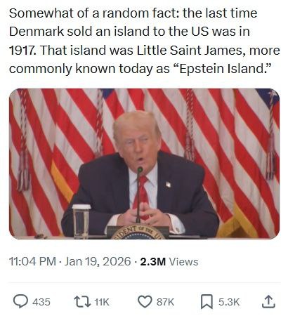 По злой иронии судьбы, последним островом, который Дания продала Америке, был Малый Сент-Джеймс. Он входил в состав архипелага Датская Вест-Индия, который датчане уступили американцам в 1917 году за 25 миллионов долларов (сейчас это Виргинские острова). Так вот Малый Сент-Джеймс больше известен широкой общественности, как «остров Эпштейна». Того самого педофила и VIP-сутенера Джеффри Эпштейна, бумаги которого попортили Трампу так много крови.