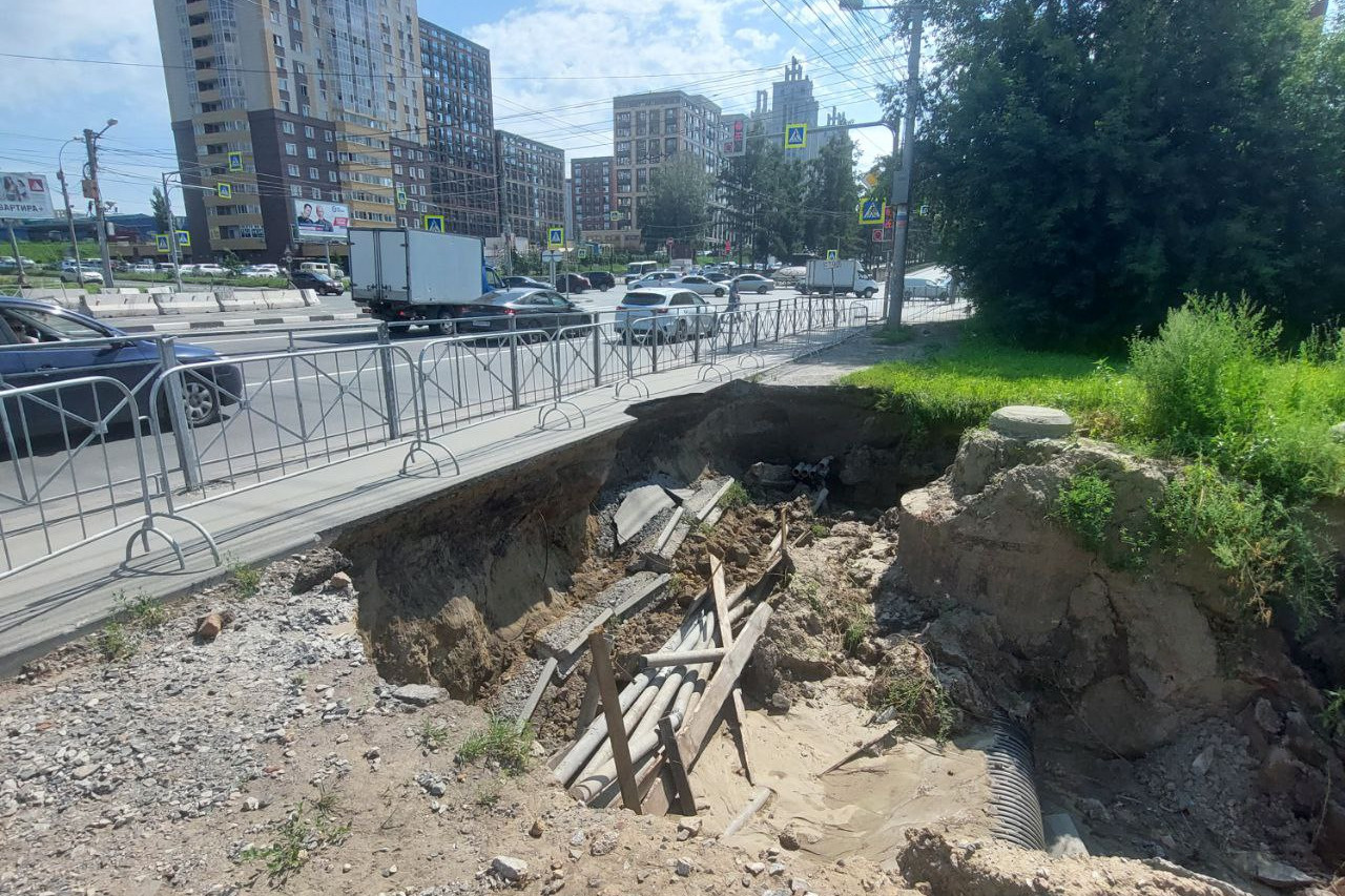 Как рассказали НГС в пресс-центре мэрии Новосибирска, размыв и обрушение дороги на пересечении улиц Северной и Красного проспекта произошел из-за ливня. МКУ «Гормост» должен починить огромную яму, выполнить комплекс строительно-монтажных работ по устройству укрепления откоса до 28 августа.