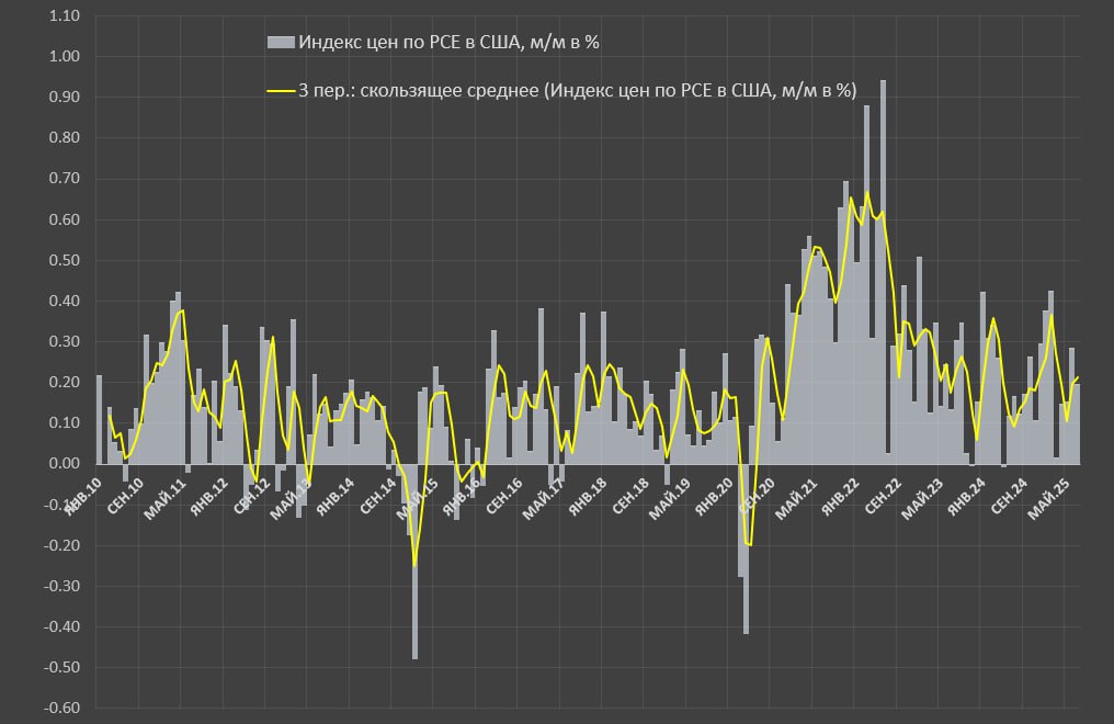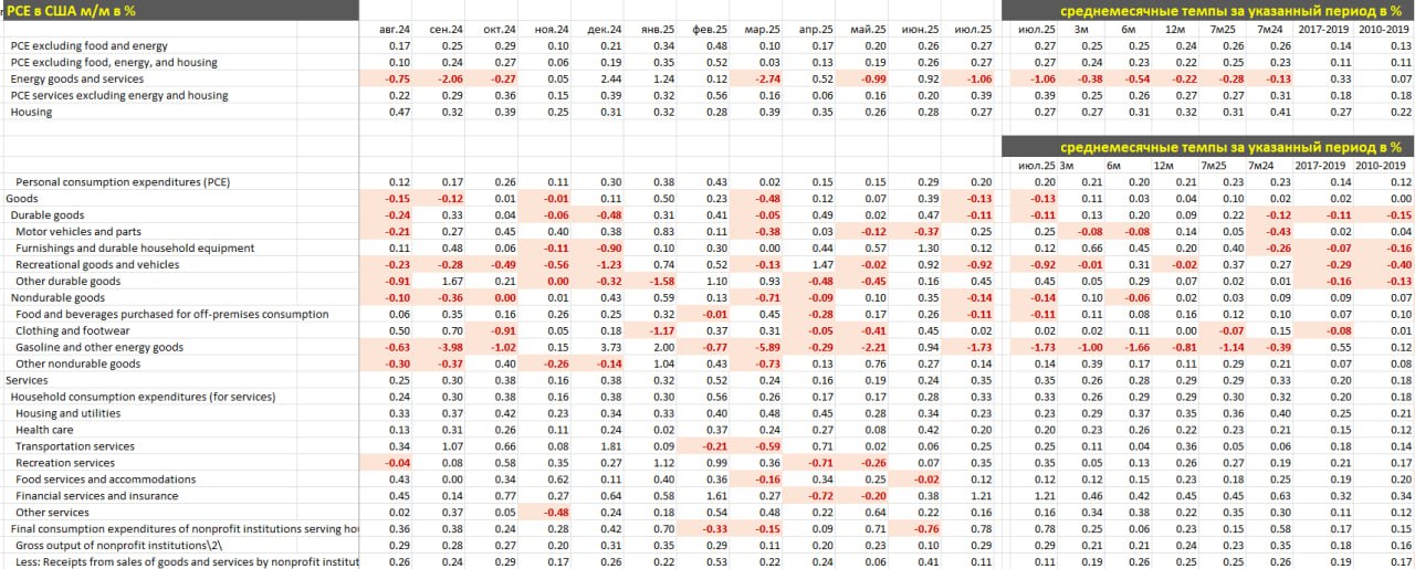 По PCE рост цен составил 0.2% м/м в июле после 0.29% в июне, за 3м – 0.21%, 6м – 0.2%, 12м – 0.23%, 7м25 – 0.23% vs 0.23% за 7м24 при среднесрочной норме 0.14% в 2017-2019 и долгосрочной норме 0.12% в 2010-2019 по среднемесячному изменению цен.
