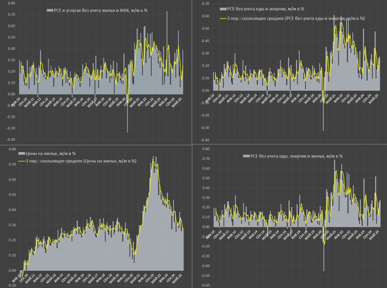 Я не просто так привел распределение по периодам. Инфляция, очищенная от волатильных компонентов, очень ровно идет в узком диапазоне 0.24-0.26% последние 12м, что вдвое выше нормы и соответствуя более 3% в годовом выражении.