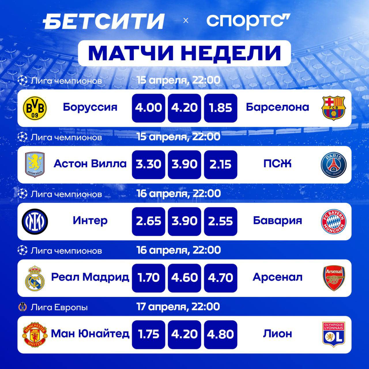 🇪🇺 ⚡🇪🇺 Ответные матчи еврокубков уже на этой неделе! Все ждут очередной великий камбэк от «Реала», но справиться с «Арсеналом» будет очень сложно. «Баварии» тоже нужно отыгрываться после внезапного поражаения в первом матче, а «Барса» и «ПСЖ» попробуют сохранить преимущество первых матчей.