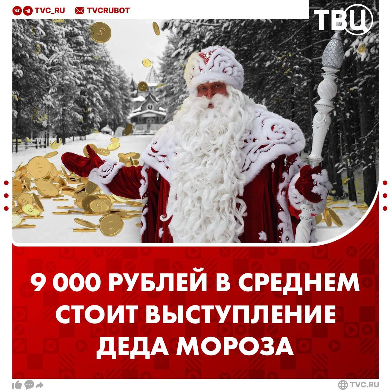 🔻🔻🔻🔻 Редакция ТВЦ дозвонилась до Деда Мороза, а точнее до двойников со всей страны. Клоны сказочного персонажа рассказали о своих расценках на 31 декабря. Оказалось, что полчаса общения с дедушкой и Снегурочкой стоят в среднем 9 000 рублей.