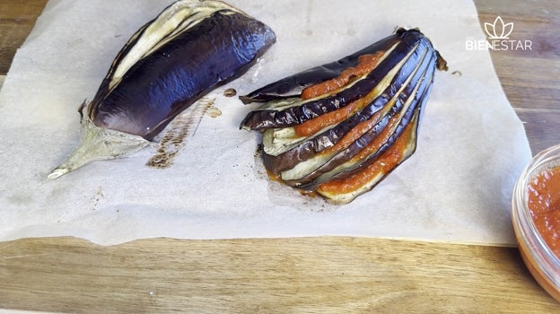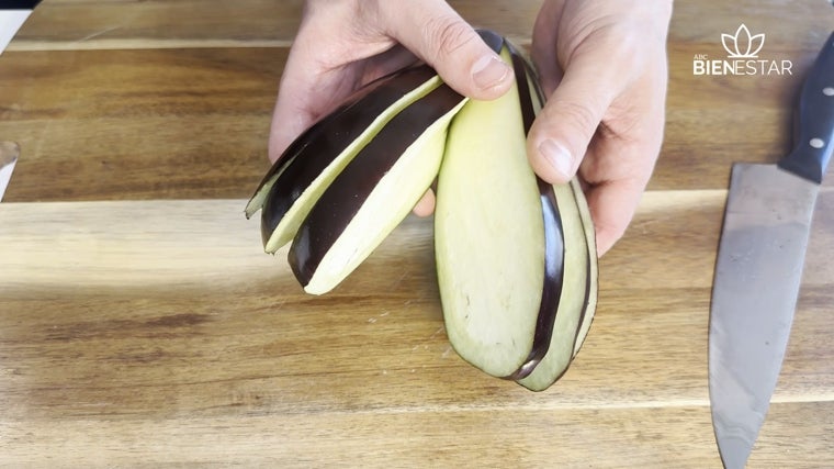 Se corta la berenjena en láminas, pero en modo abanico, es decir, sin finalizar el corte de la lámina y dejando unos centímetros sin cortar en el lado más estrecho.