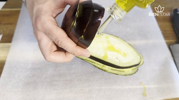 Una vez cortada se añade un poco de sal y de aceite de oliva virgen extra entre las capas. A continuación se mete en el horno hasta que queden bien cocinadas.