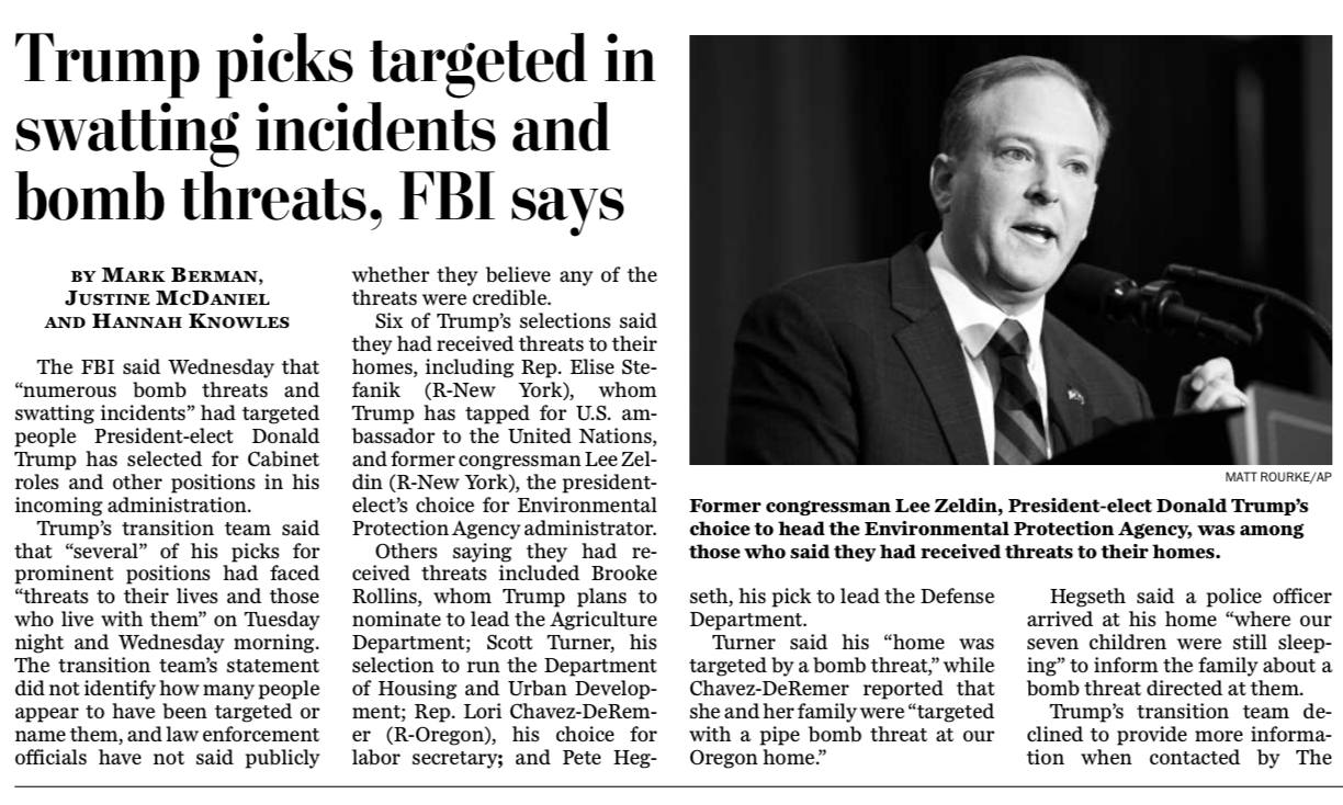 ФБР в среду сообщило, что избранный президент Дональд Трамп столкнулся с настоящим «клубом угроз» в адрес своих кандидатов в Кабинете министров. Команда Трампа заявила, что «несколько» его избранников получили предупреждения, включая сообщения о бомбах и избиениях. Об этих «тайных» людях пишет журнал The Washington Post.