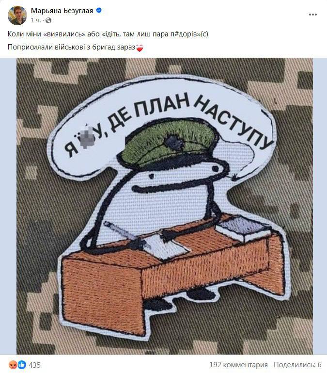 Она разместила в Facebook карикатуру на военного, который в матерной форме сообщает, что не знает, есть ли "план наступления" (ранее Безуглая утверждала, что Залужный не имеет плана войны на следующий год).