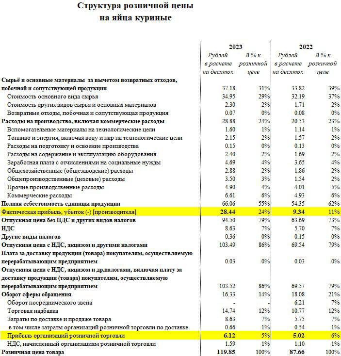 Росстат раскрывает данные по структуре розничной цены на отдельные продукты питания с задержкой 1,5 года, сейчас вложил цифры за 2023. Из них следует, что на фоне роста цен на яйцо прибыль производителей выросла х3 (с 9.3 рублей за десяток в 2022 до 28.4 рублей в 2023). При этом прибыль по яйцу в ритейле увеличилась с 5.0 до 6.1 руб за десяток. Статистика по ритейлу включает массу средних/маленьких игроков, которые не участвовали в инициативе по сдерживанию цен. Соответственно прибыль по ритейлерам, удерживающим цены, должна была снизиться.