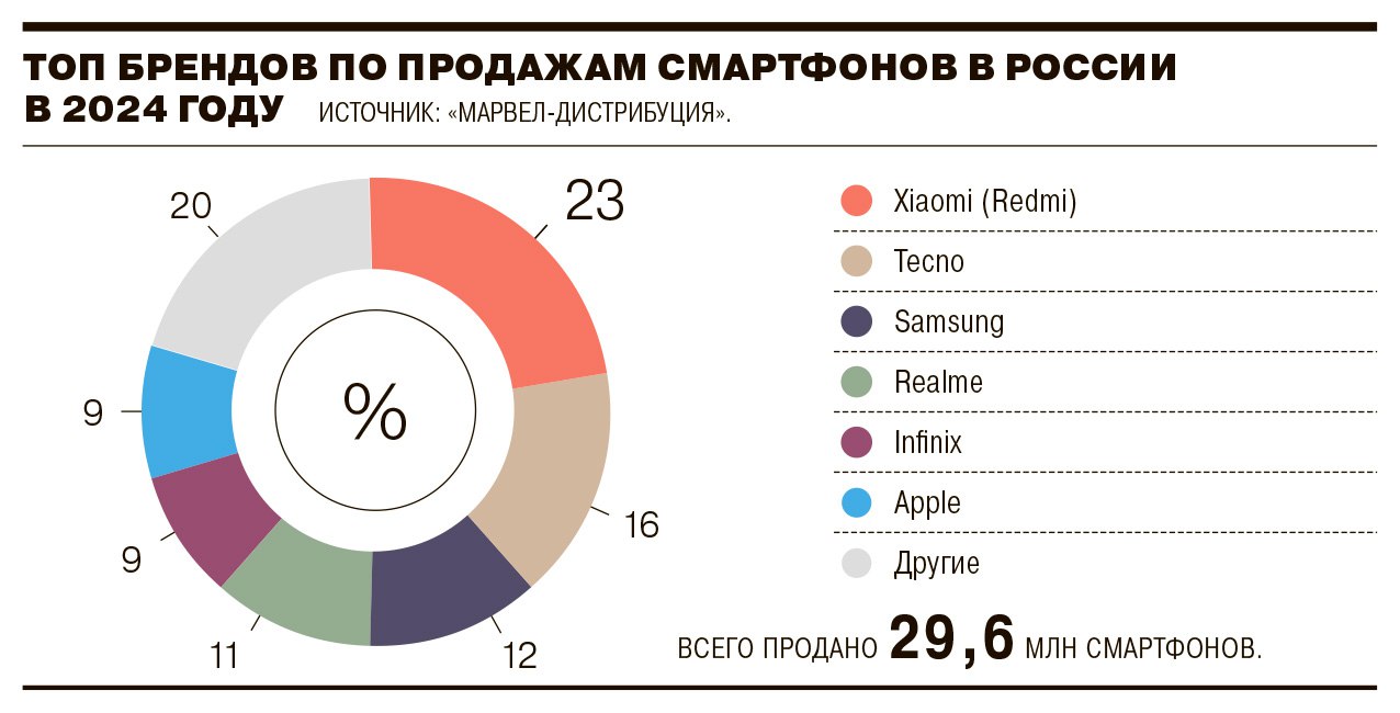 Продажи смартфонов в 2024 году сократились на 4% по сравнению с 2023 годом. При этом в деньгах показатель увеличился на 5%. Лидером остался Xiaomi вместе с суббрендом Poco, заняв 23% рынка в штуках. Замыкает пятерку лидеров Apple, который нарастил свою долю до 9% (годом ранее 8%, а по итогам 2022 года 10%). В деньгах лидером остался Apple (32%), следом Samsung, Xiaomi и Tecno.