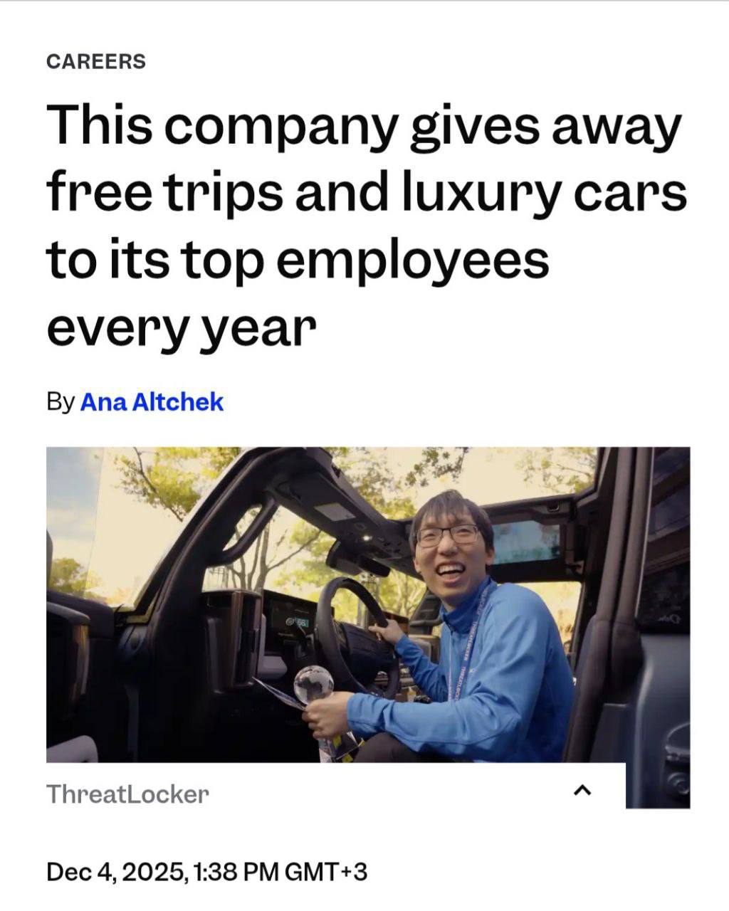 Это традиционный подарок к Рождеству от компании ThreatLocker — каждый год они выбирают двух самых продуктивных сотрудников и дарят им машины по итогам голосования коллектива из более чем 700 человек.