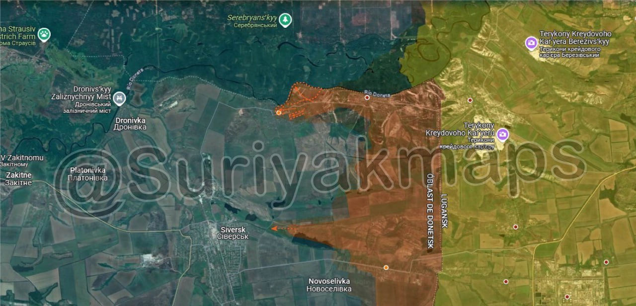 За последние семь дней российская армия полностью заняла восточную часть Серебрянки. Кроме того, российские силы пытаются взять под контроль основные линии окопов к востоку от города Северск.