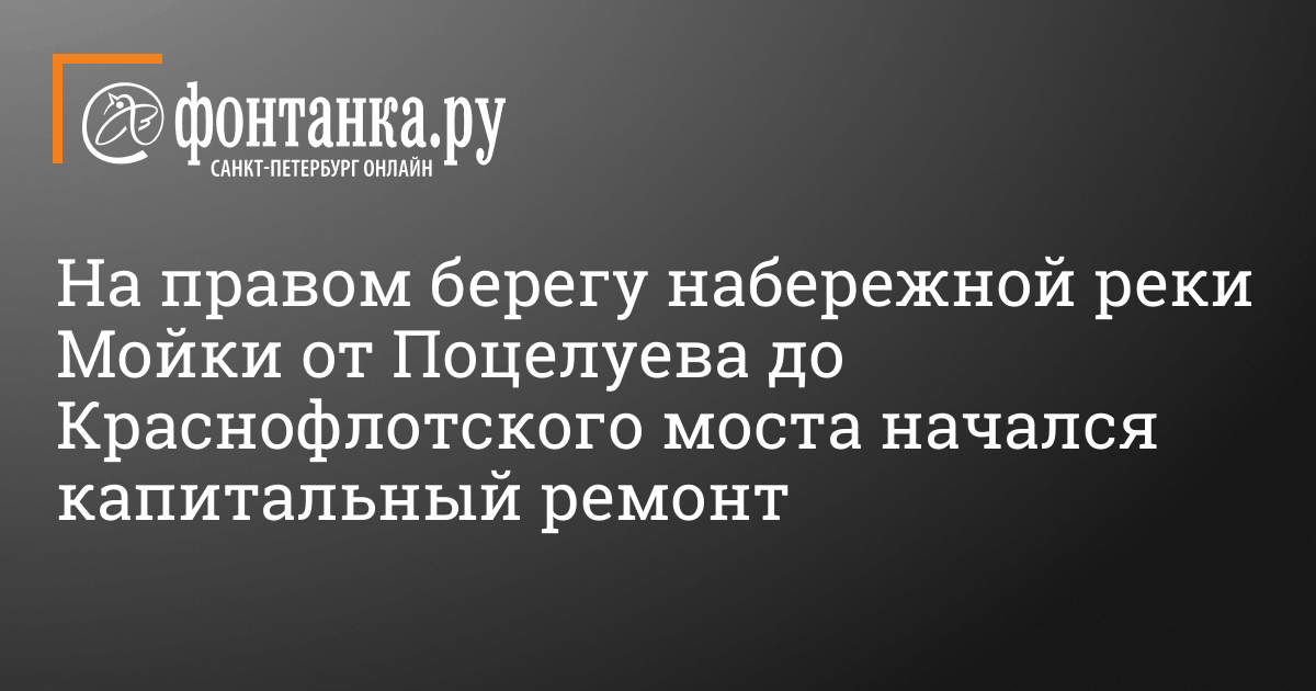 Капитальный ремонт начался на правом берегу набережной реки Мойки от Поцелуева до Краснофлотского моста в Петербурге. Об этом 28 марта сообщает «Мостотрест». Из-за работ сократят габариты на пересечении проезжих частей набережной Крюкова канала и Большой Морской улицы, что затруднит проезд большегрузного транспорта.