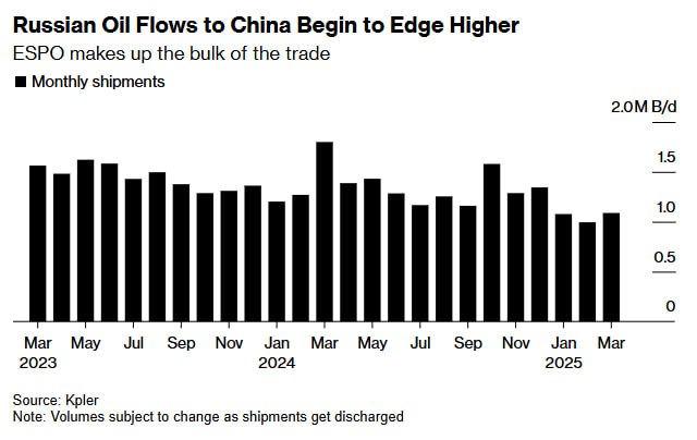 ▪️В этом месяце российские поставки в Китай оцениваются в 1,15 млн баррелей в день, что на 16% выше февральского показателя и является самым большим дневным объемом с декабря, согласно данным, отслеживаемым компанией Kpler. Наибольшая доля приходится на ВСТО. #Россия #Китай