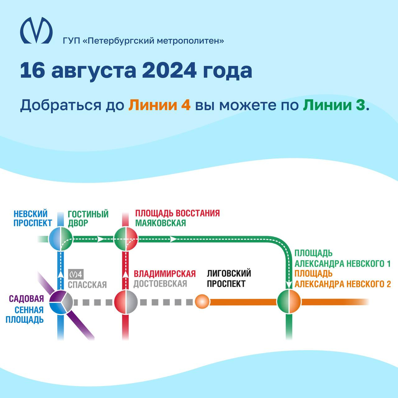 Так, 16 августа «Достоевская» и «Спасская» будут закрыты для входа, выхода и пересадки. Пассажирам рекомендовали пользоваться станциями «Владимирская», «Сенная площадь», «Садовая». На оранжевой ветке поезда будут курсировать только между «Лиговским проспектом» и «Улицей Дыбенко».