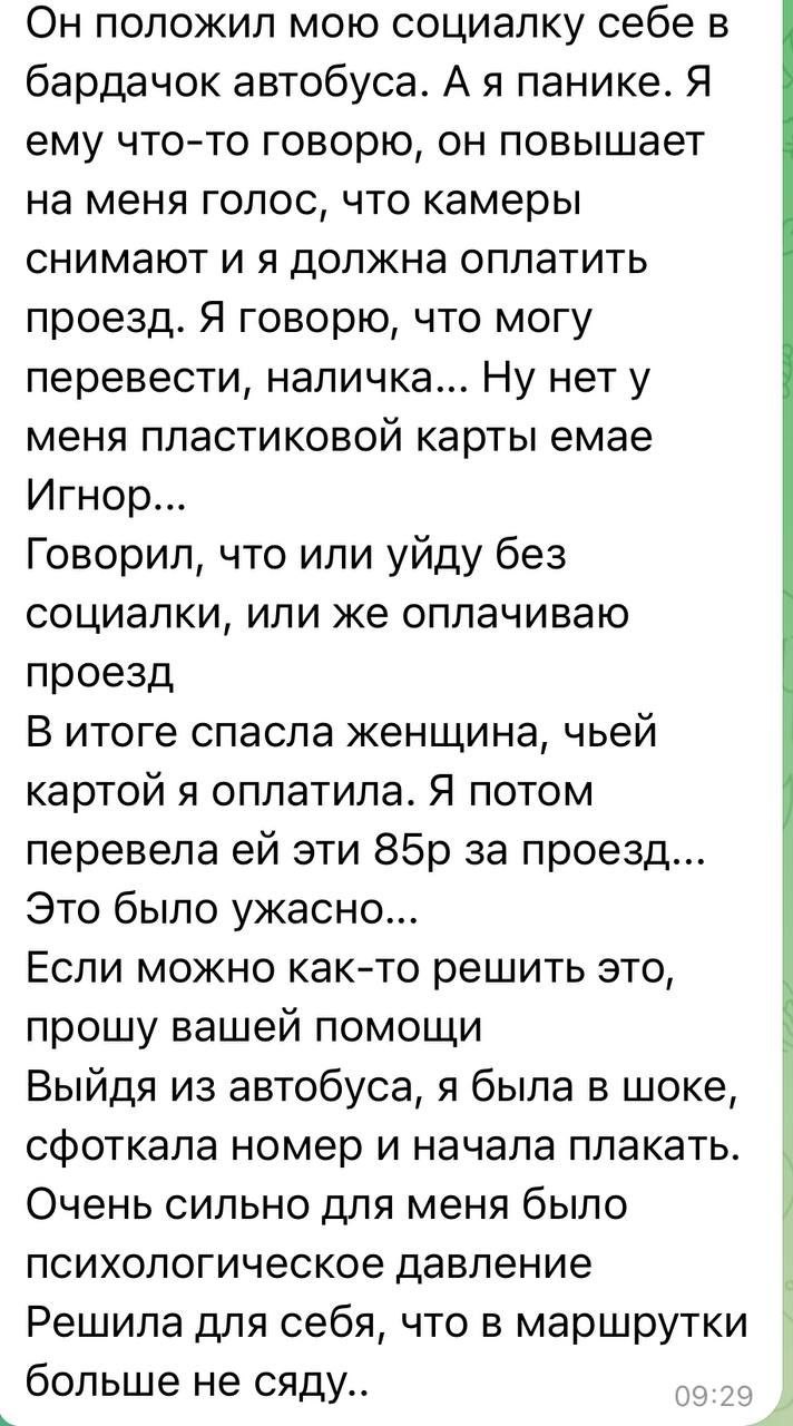 «Иностранный специалист» требовал оплату, кричал, довёл девочку до слёз, не выпускал из автобуса и в итоге отобрал социальную карту, спрятав её в бардачок.