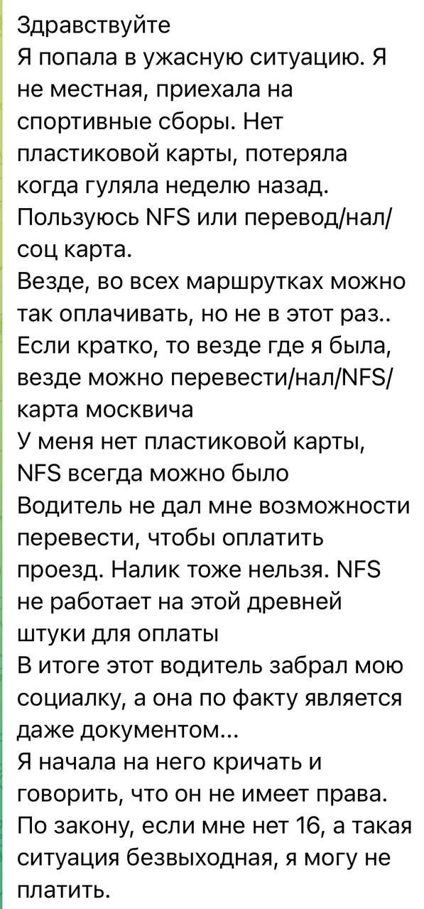 Известно, что девочка приехала в Москву на спортивные сборы и потеряла пластиковую карту. Но в Москве везде работает NFS, поэтому проблем с оплатой не возникало. Однако именно в этом автобусе устройство не работало. Девочка предложила оплатить проезд переводом или наличными, но водитель, оказавшийся гражданином Киргизии, устроил ребёнку скандал. Девочку спасла незнакомая женщина, оплатившая проезд своей картой.