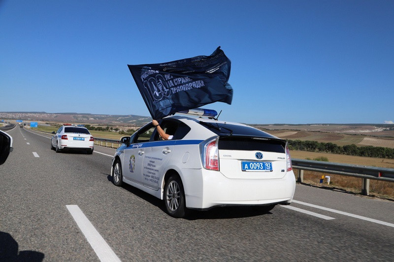 Севастопольские участковые уполномоченные приняли флаг у своих крымских коллег. Передача флага «100 лет на страже правопорядка» состоялась у стелы на въезде в город-герой. Под аккомпанемент оркестра культурного центра УМВД полковник Роман Ганжа, начальник отдела участковых уполномоченных УМВД России по г. Севастополю, получил его из рук представителя Крыма — полковника полиции Виктории Гоптаревой.