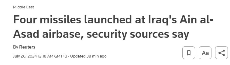 🚀 Две ракеты попали на территорию базы Айн-аль-Асад, а еще две поразили периметр, пишет Reuters.