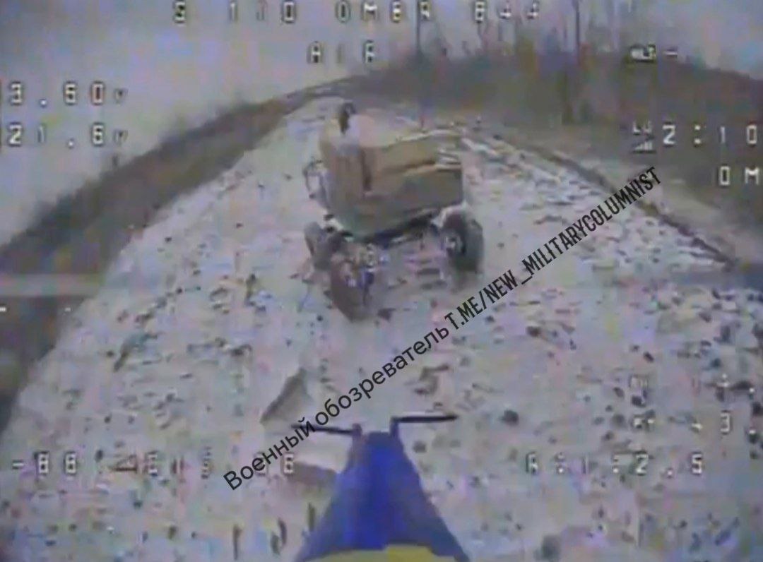 Дистанционно-управляемая "тележка" российских военных с боеприпасами за мгновение до поражения её украинским FPV - камикадзе на Авдеевском направлении фронта.