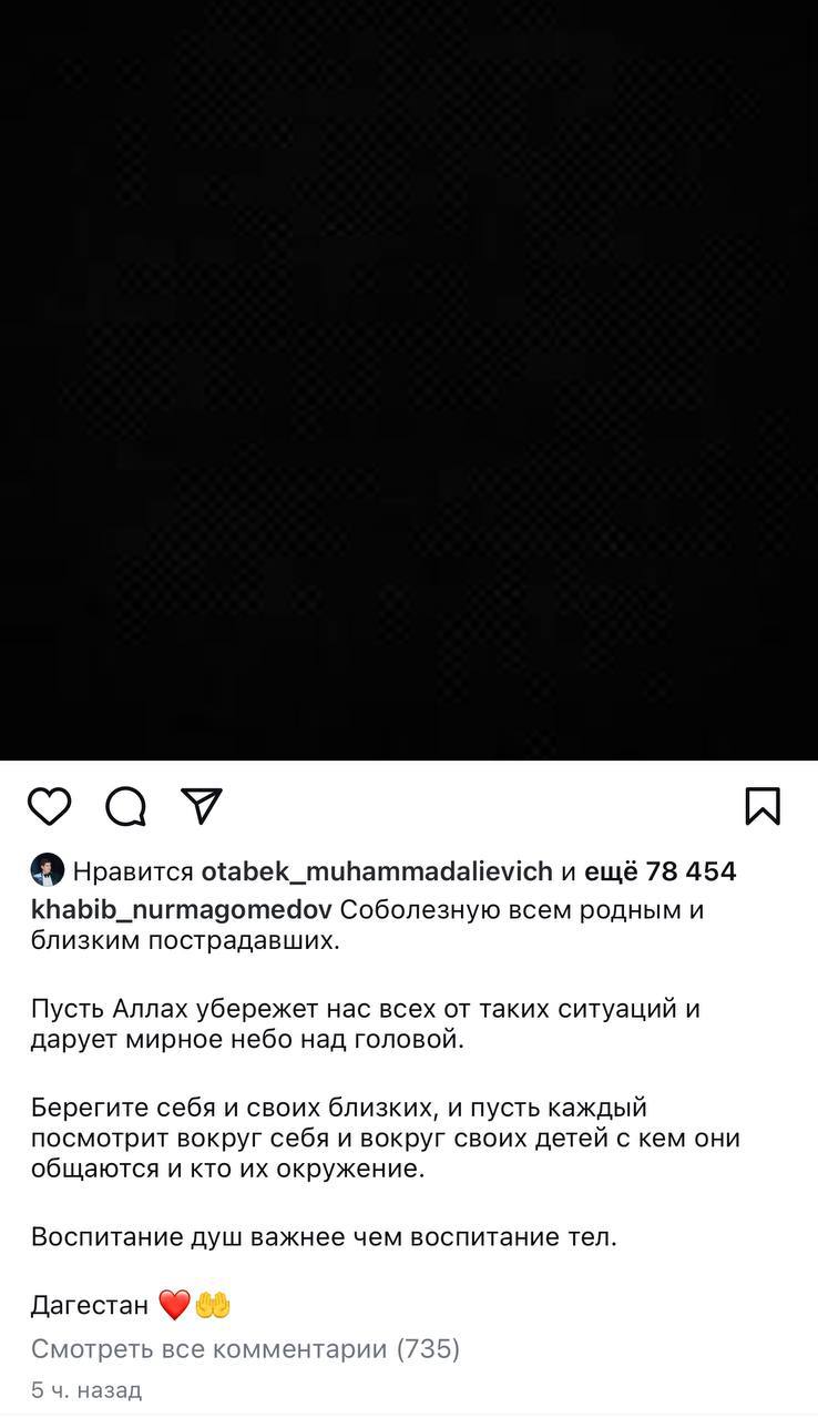 Хабиб Нурмагомедов выразил соболезнования родным пострадавших при стрельбе в Дагестане.