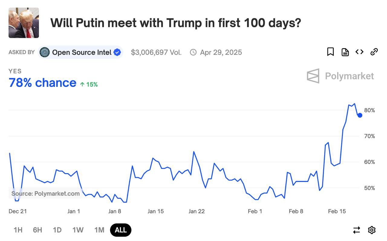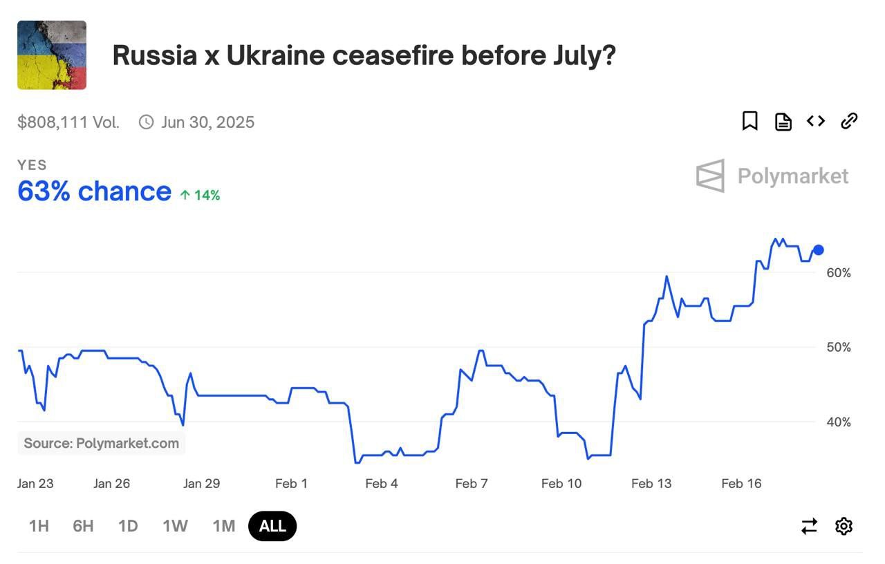 Ставки на прекращения войны в Украине в этом году на букмекерской платформе Polymarket выросли до 63%, а на встречу Путина и Трампа в ближайшие два месяца - до 78%.
