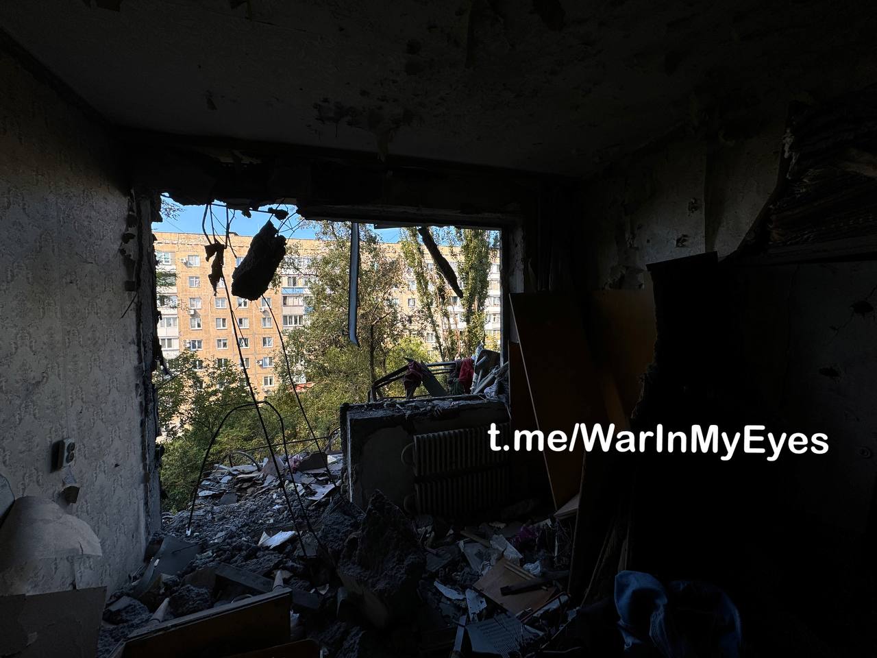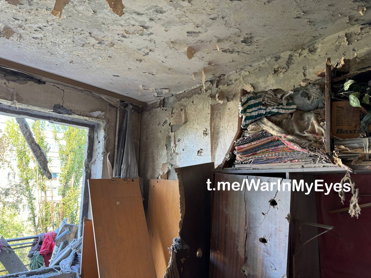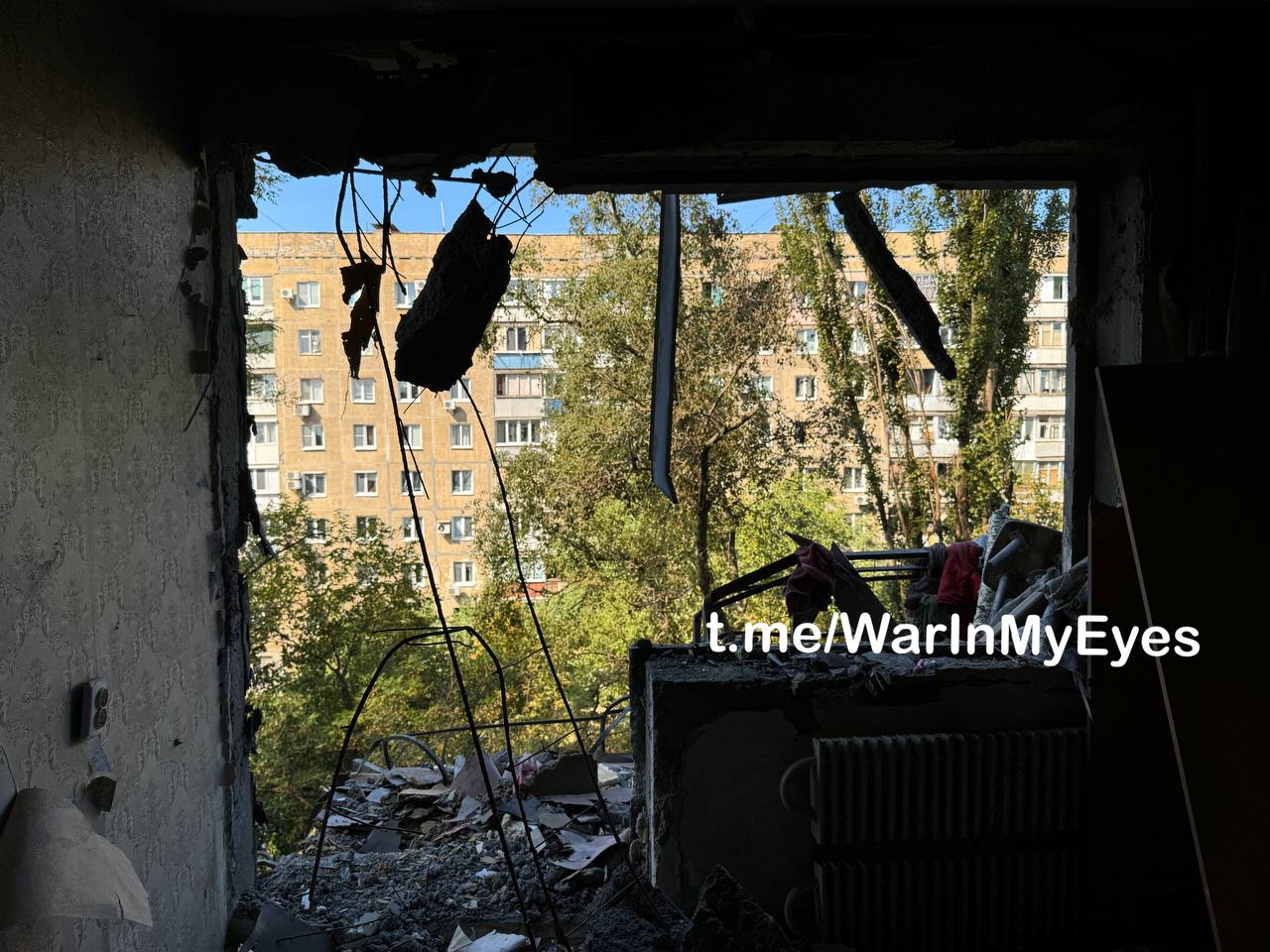 Последствия обстрела Петровского района Донецка, Добровольского 1, прямое попадание 155 мм снаряда в 6 этаж.