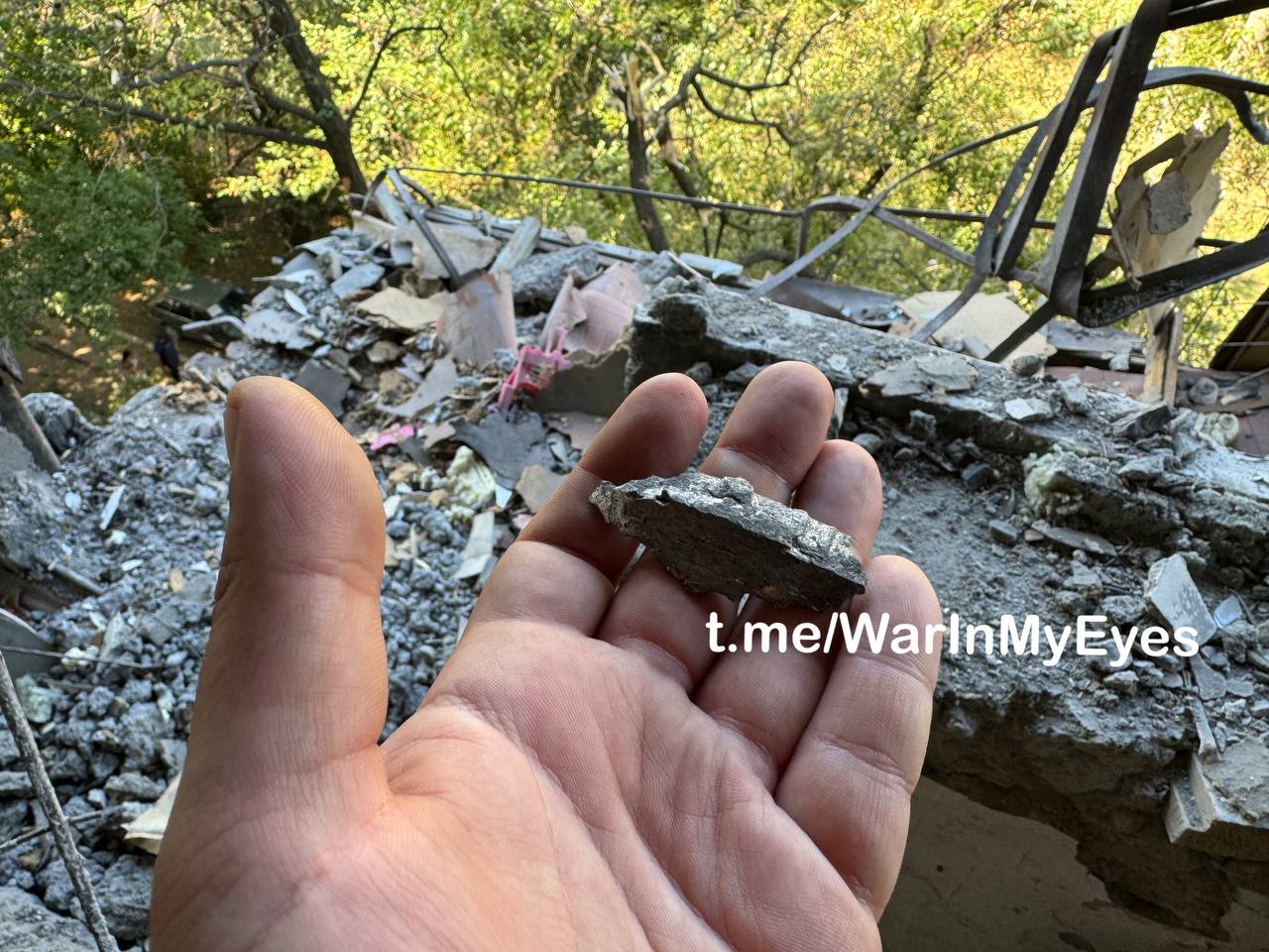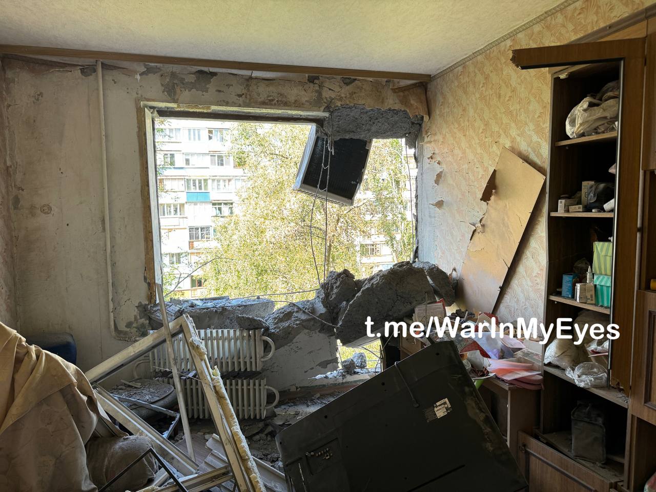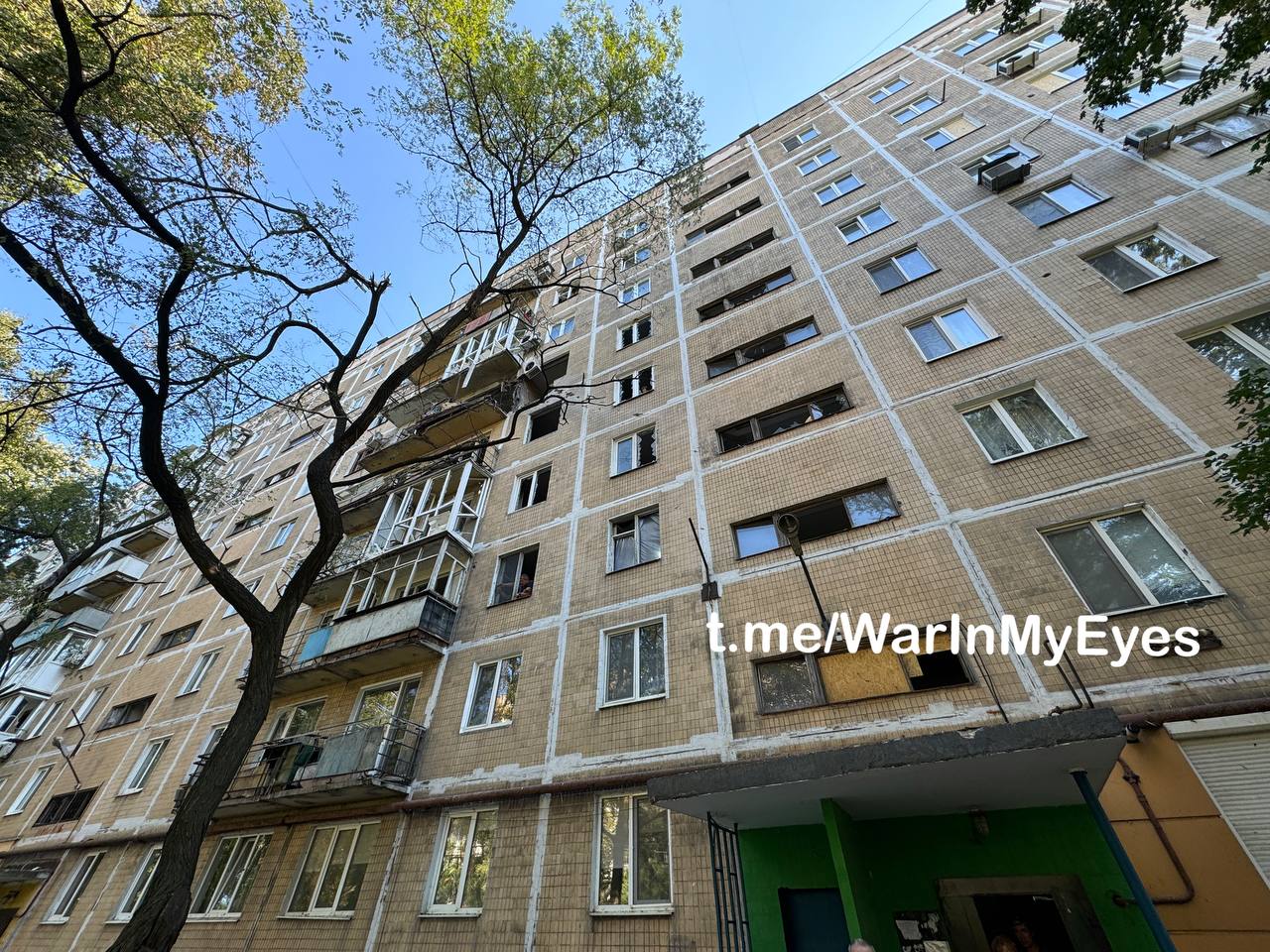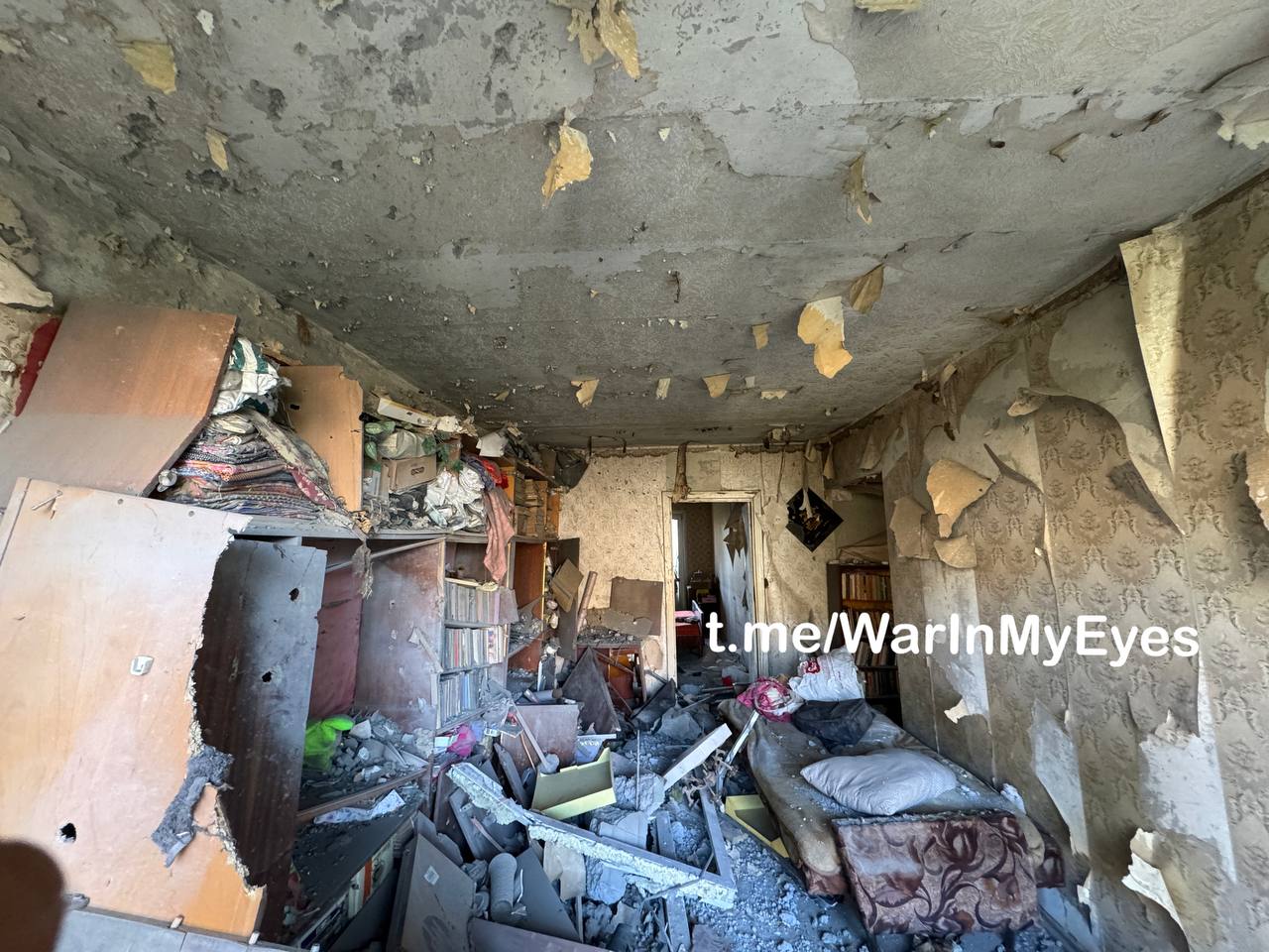 Последствия обстрела Петровского района Донецка, Добровольского 1, прямое попадание 155 мм снаряда в 6 этаж.