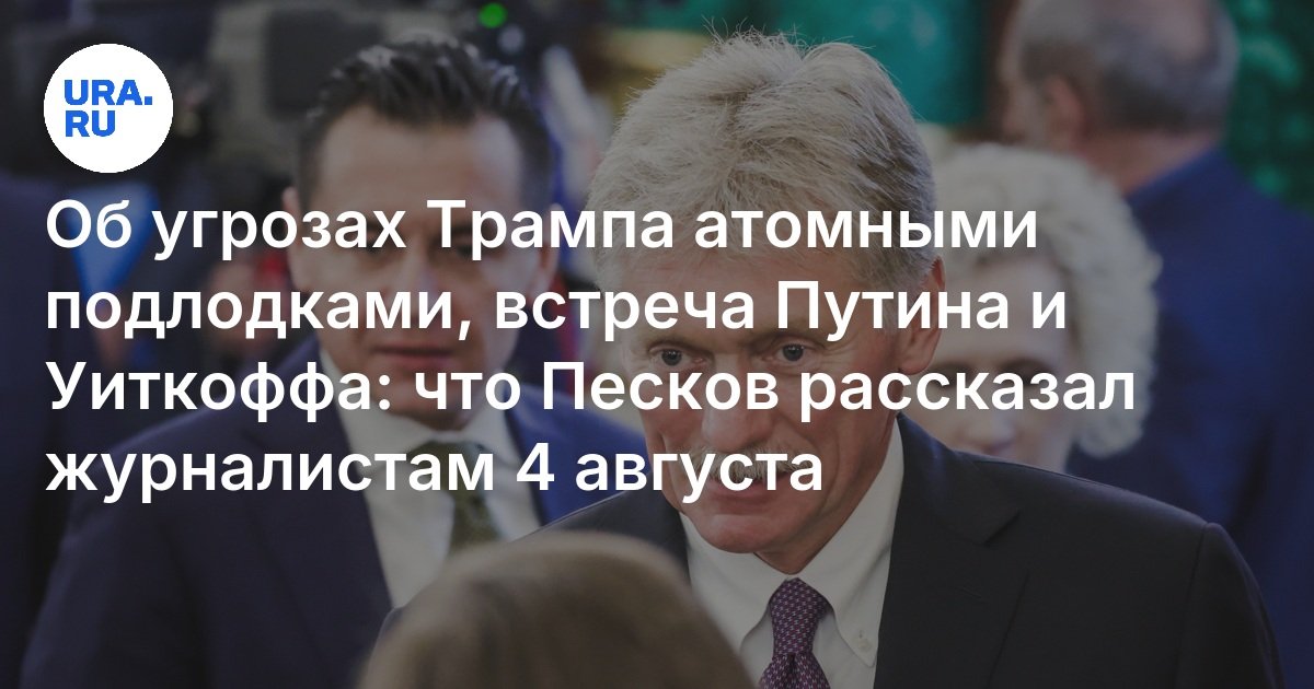 Пресс-секретарь президента России Дмитрий Песков во время конференц-колла прокомментировал позицию Кремля в связи с заявлениями Дональда Трампа о направлении американских подводных лодок к российским берегам. Помимо этого, Песков сообщил о перспективах возможной встречи главы российского государства Владимира Путина со специальным посланником США Стивом Уиткоффом. Подробнее о других заявлениях Пескова — в материале URA.RU.