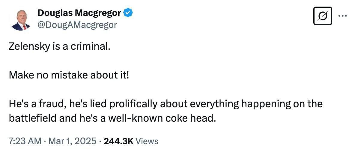 «Зеленский — преступник. Можете не сомневаться! Он мошенник, он много лгал о происходящем на поле боя и, как хорошо известно, сидит на кокаине».
