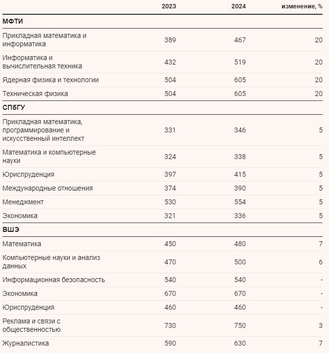 Рекордсменом стал Московский физико-технический институт (МФТИ): поднял цены на обучение по образовательным программам бакалавриата в среднем на 20%. Стоимость программы «прикладная математика и физика» в вузе выросла с ₽389 тыс. до ₽467 тыс. по сравнению с прошлым годом, «информатика и вычислительная техника» — с ₽432 тыс. до ₽519 тыс., «ядерная физика и технологии» — с ₽504 тыс. до ₽605 тыс. На 2024/25 учебный год средняя стоимость обучения составит около ₽560 тыс.