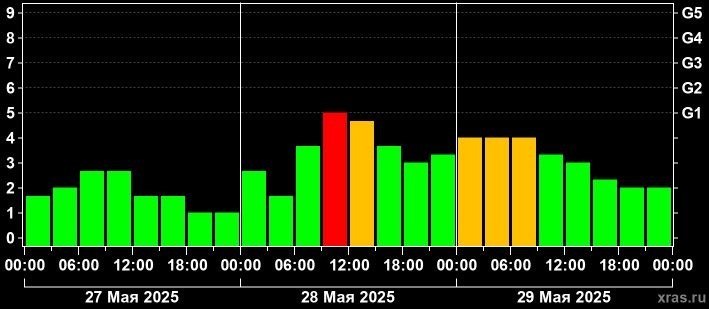 Затем магнитосфера успокоится. Следующая вспышка геомагнитной активности ожидается с 0:00 до 9:00 29 мая.