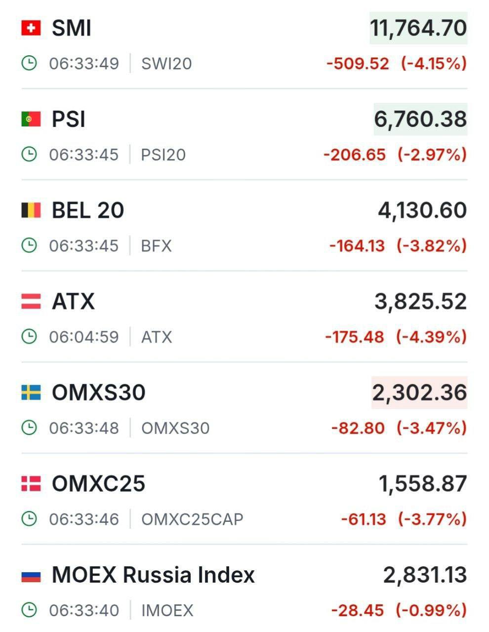 Европейские фондовые рынки резко снижаются, при этом наибольшее падение наблюдается в Италии, Испании и Германии.