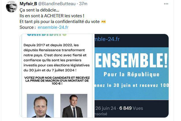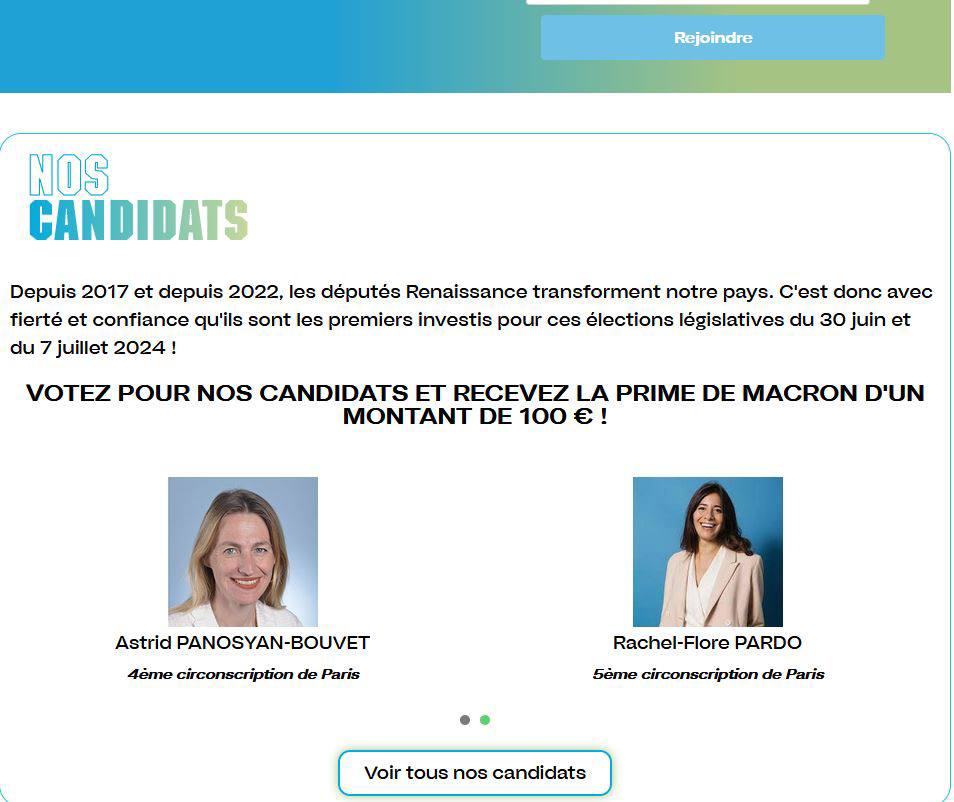 Французские пользователи X (Twitter) обнаружили необычную рекламу партийного объединения Ensemble - https://ensemble-24.fr/, так называемого «президентского большинства», в которую входят несколько французских партий, включая партию Эммануэля Макрона Ренессанс. На сайте Ensemble представлен список кандидатов от коалиции, над которым размещен призыв приходить на выборы 30 июня и 7 июля и проголосовать.