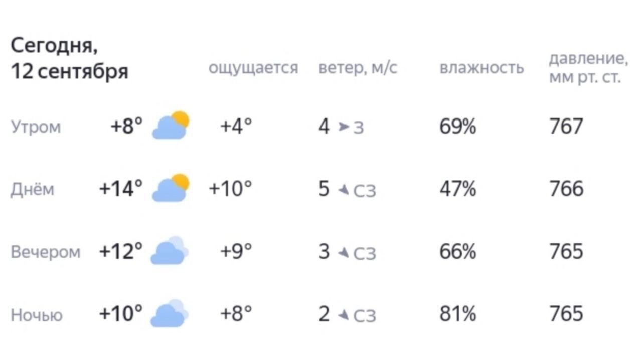 В пятницу, 12 сентября, средняя температура в Югре составит +11…+16 градусов днем, и +1…+6 градусов — ночью. В северной части днем может потеплеть до +21 градуса, в центральной, восточной и южной — ночью похолодает до -4 градусов. Также прогнозируют небольшой дождь. Ветер — северо-западный с переходом в западный, 4-9 м/с.