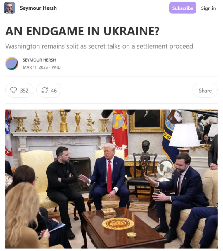 Известный американский журналист-расследователь Сеймур Херш пишет, со ссылкой на свои источники, что некоторые из тех, кто участвует в тайных переговорах между Украиной и Россией, убеждены, что затянувшийся конфликт вскоре закончится тщательно продуманным разделением территорий Украины.