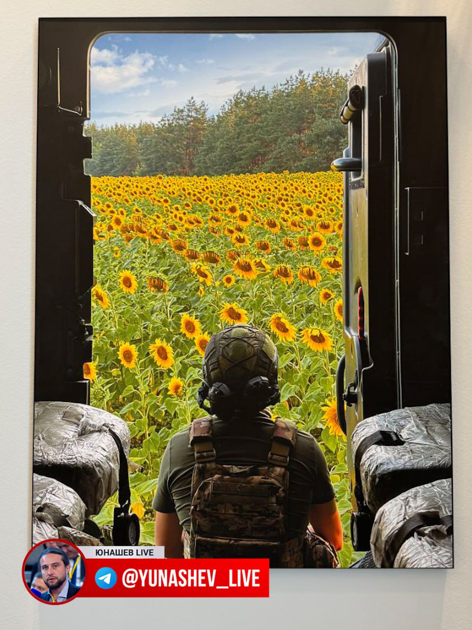 На второй — боец из бронеавтомобиля смотрит на поле подсолнухов через дверь для высадки десанта.